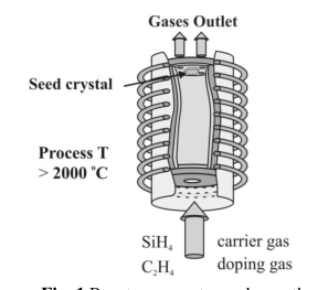 在密闭反应器中,保持合适的反应温度(2000-2300℃)和压力(40kPa),反应炉内通入由H2或者He载带的SiH4和C2H4。反应气体在高温下分解生成碳化硅并附着在衬底材料表面,并沿着材料表面不断生长。通过控制反应容积的大小、反应温度、压力和气体组分等条件,得到最佳工艺条件。
